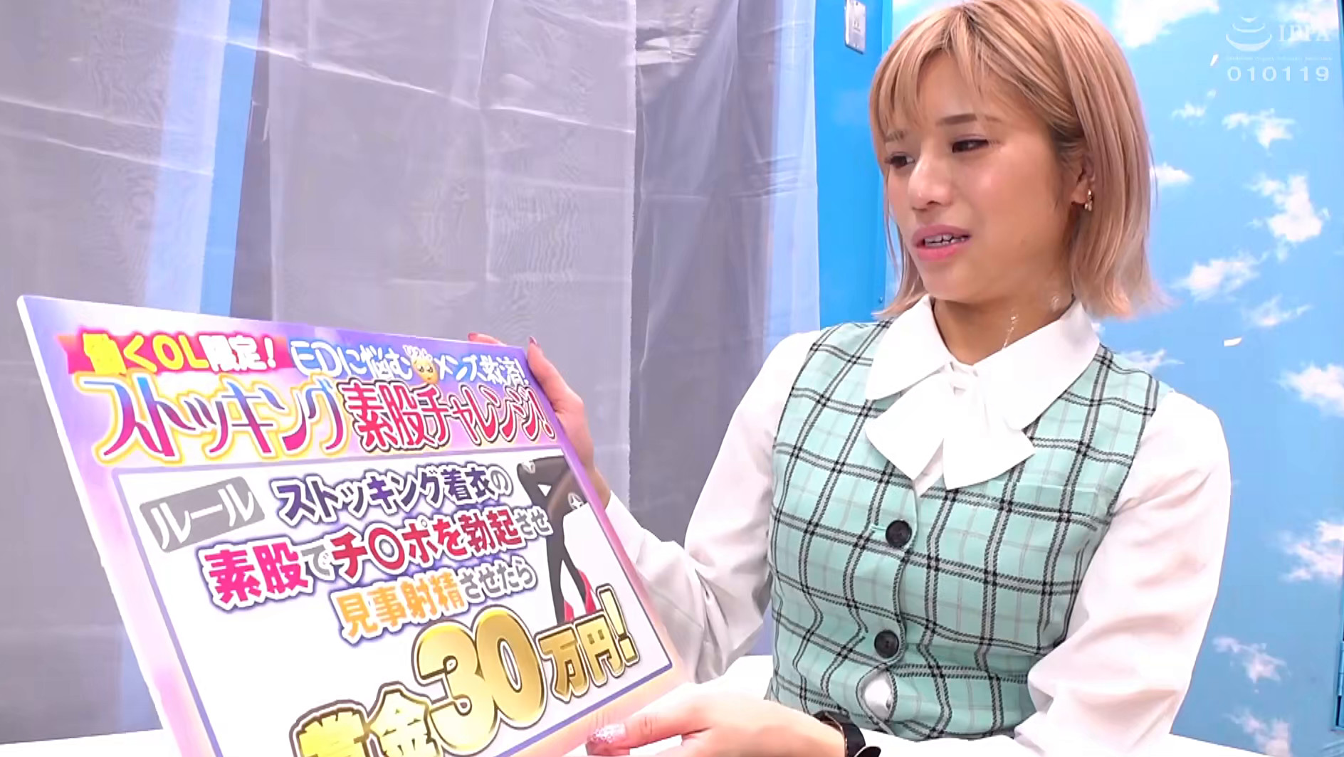 一日中立ちっぱなしで美脚が蒸れたOLが挑戦するガニ股素股チャレンジ!光るストッキングでEDフニャチンを持続可能な勃起でイカせられたら賞金30万円!